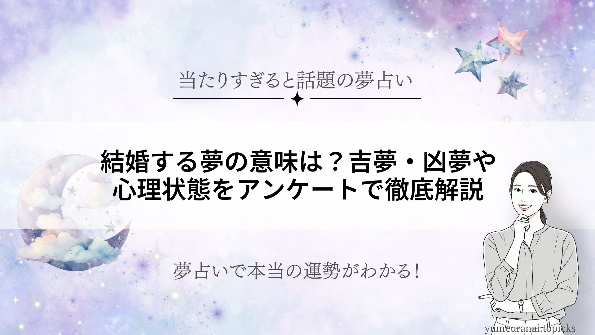 結婚する夢を見て、「もしかして良いことが起きる前触れ?」とドキドキした経験はありませんか。 本記事では、結婚する夢にまつわるリアルなアンケート結果や、夢占いの専門的な解釈、具体的な夢のシチュエーション別の意味まで徹底解説します。 あなたの... -
