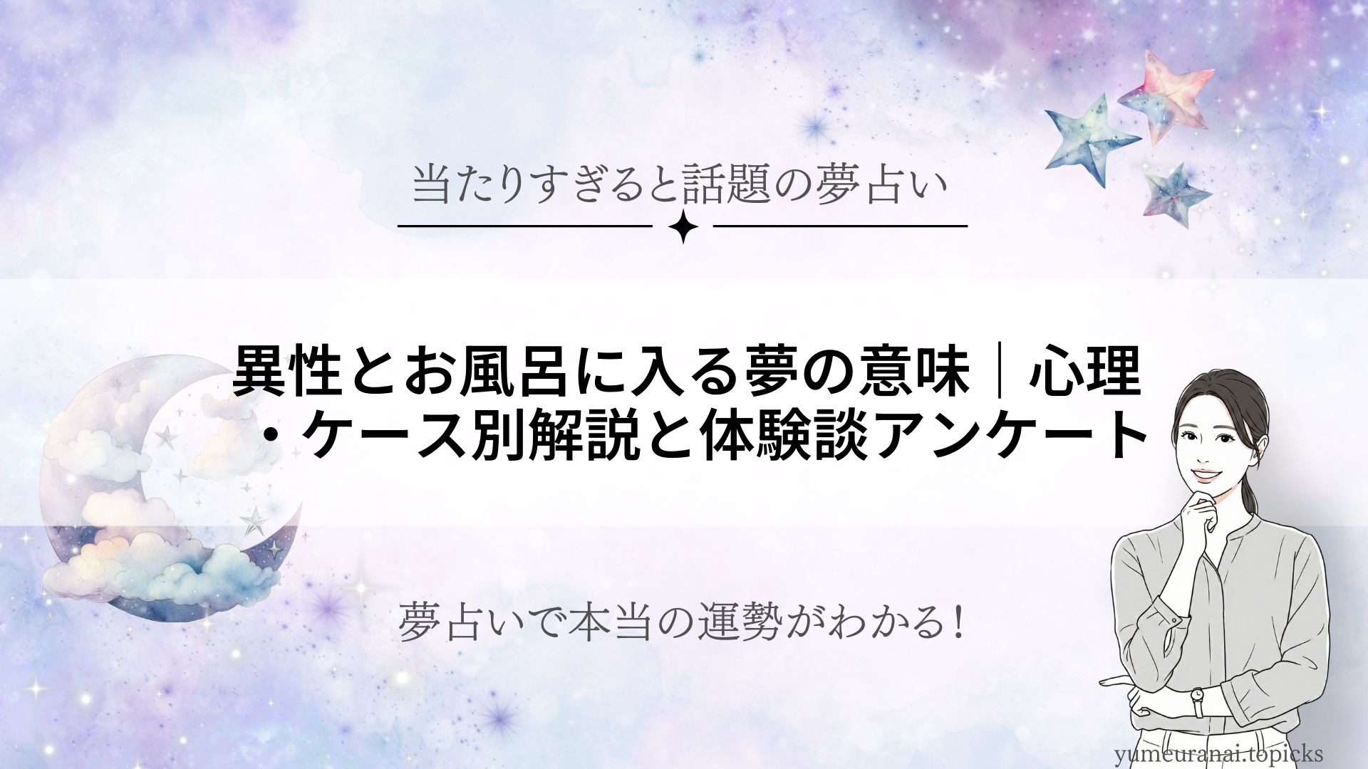 夢の中で「異性とお風呂に入る夢」を見たことはありませんか?こんなシチュエーションは日常ではなかなか起こらないだけに、目覚めた後も強く印象に残るものです。この夢には恋愛や人間関係、あなた自身の心の状態を映し出す深いメッセージが込められています。本記事では、実際のアンケートや夢鑑定士による解説をもとに、「異性とお風呂に入る夢」の意味や心理状態、ケース別の細かな暗示まで、わかりやすく徹底解説します。自分自身や大切な人の夢のメッセージを、ぜひ一緒に紐解いていきましょう。