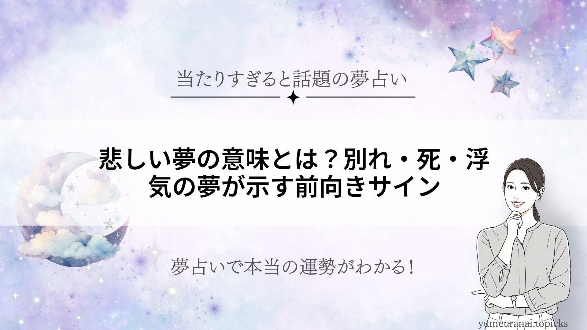「悲しい夢」を見ると、朝から気分が落ち込んでしまうことも多いですよね。しかし、夢占いの観点から見ると、悲しい夢には意外にもポジティブなメッセージが隠されていることがあります。悲しみや不安を感じる夢だからこそ、今のあなたの心の状態や人生の転機を知らせる大切なサインかもしれません。本記事では、「別れ」「死」「浮気」など代表的な悲しい夢の意味と、そこから得られる前向きな気づきについて解説します。悲しい夢に隠された本当のメッセージを知り、毎日をもっと明るく過ごすヒントを見つけてください。