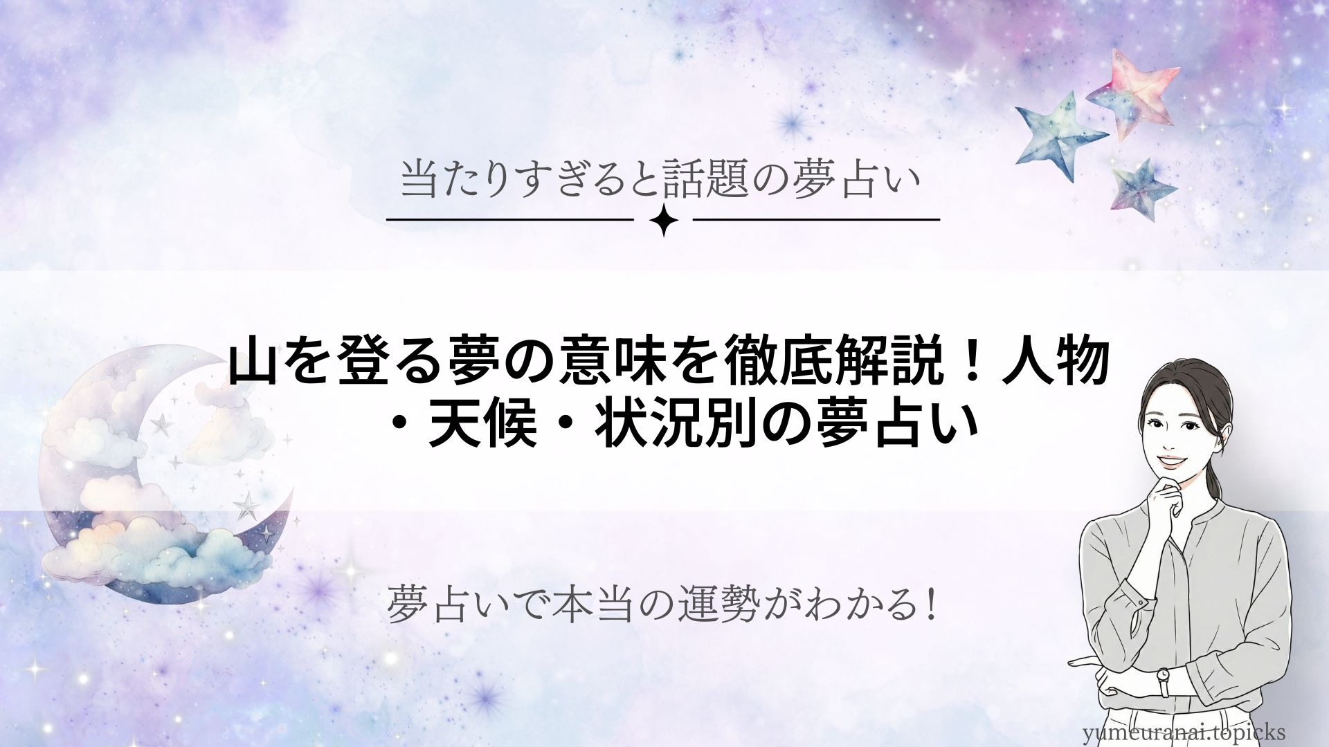 山を登る夢を見たとき、「どんな意味があるの?」と気になった方も多いのではないでしょうか。山登りの夢は、挑戦や成長、目標に向かう気持ちを表すことが多いとされます。しかし、その意味は夢の中の状況や登場人物、天候によって大きく変わります。本記事では、山を登る夢の基本的な意味から、シチュエーション・人物・天候別の詳細な解釈まで、わかりやすくお伝えします。夢占いの視点から、あなたの心の動きやこれからのヒントを読み解きましょう。