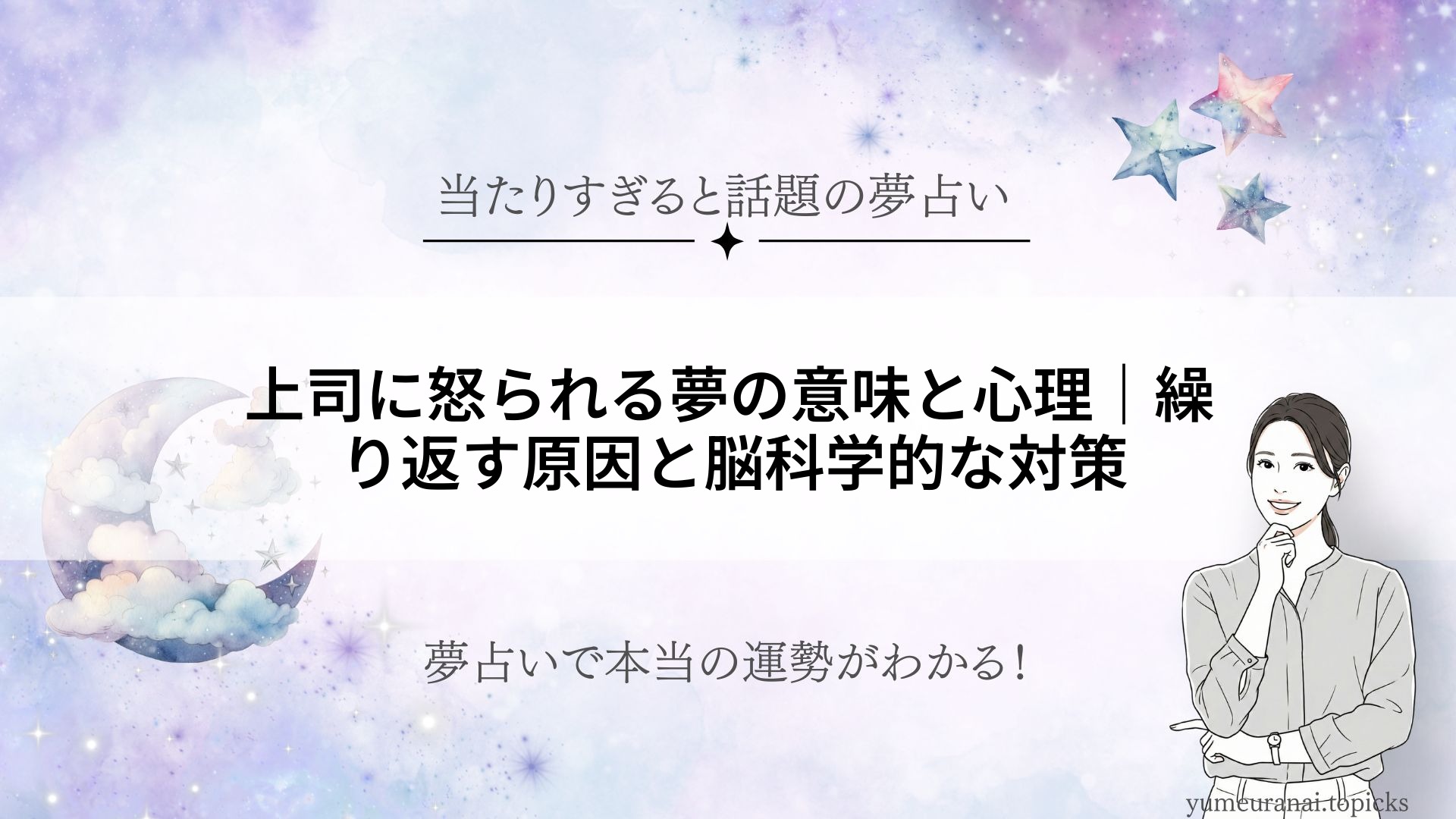 「上司に怒られる夢」を繰り返し見てしまい、朝から気分が沈んでしまう…。そんな経験はありませんか?この夢にはどんな意味や心理が隠されているのでしょうか。本記事では、脳科学や夢占い、精神医学の観点から「上司に怒られる夢」の原因や対策を徹底解説... -