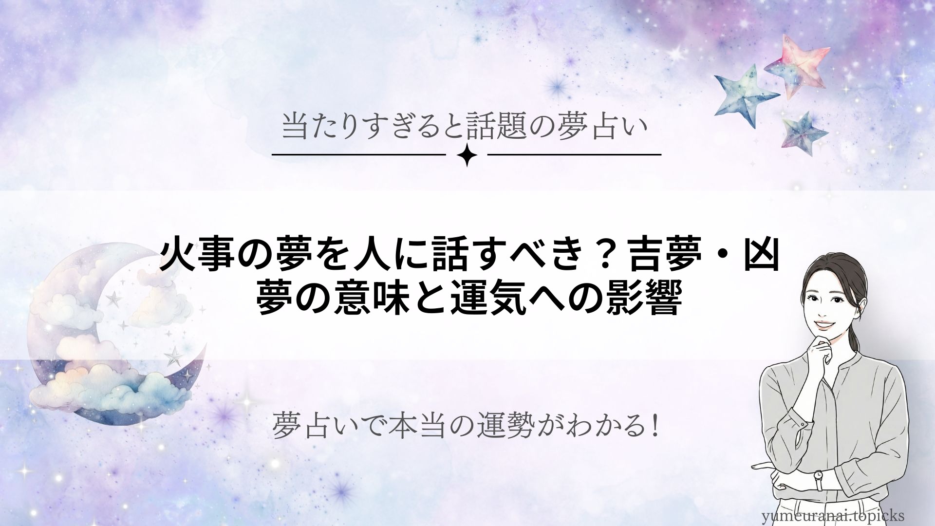 火事の夢を見たとき、「この夢を人に話してもいいの?」と迷うことはありませんか? 火事の夢は吉夢か凶夢かによって意味が異なり、話すべきかどうかも変わります。 今回は「火事の夢」というテーマで、心理状態や夢の持つ意味、運気への影響、さらに人に... -
