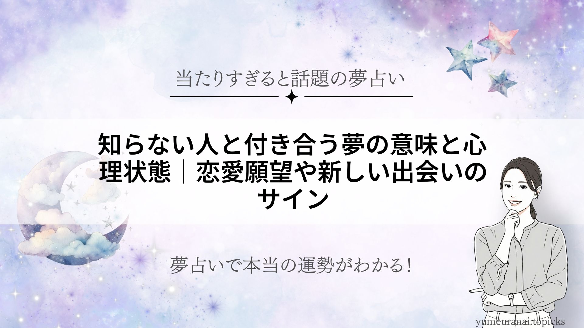 夢の中で「知らない人と付き合う夢」を見ると、起きた後も不思議な気持ちや疑問が残るものです。この夢にはどんな意味や心理状態が隠れているのでしょうか?本記事では、「知らない人と付き合う夢」を中心に、誰かと付き合う夢全般の心理状態や行動別の意... -