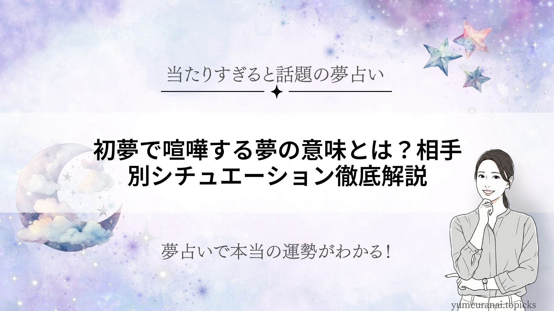 新年最初に見る「初夢」。その夢が「喧嘩する夢」だった場合、あなたはどんな意味を感じますか?本記事では、初夢が持つ深い意味や、相手・シチュエーションごとの夢占い解釈を詳しく解説します。もし初夢に喧嘩が現れたら吉兆なのか、それとも注意すべき... -