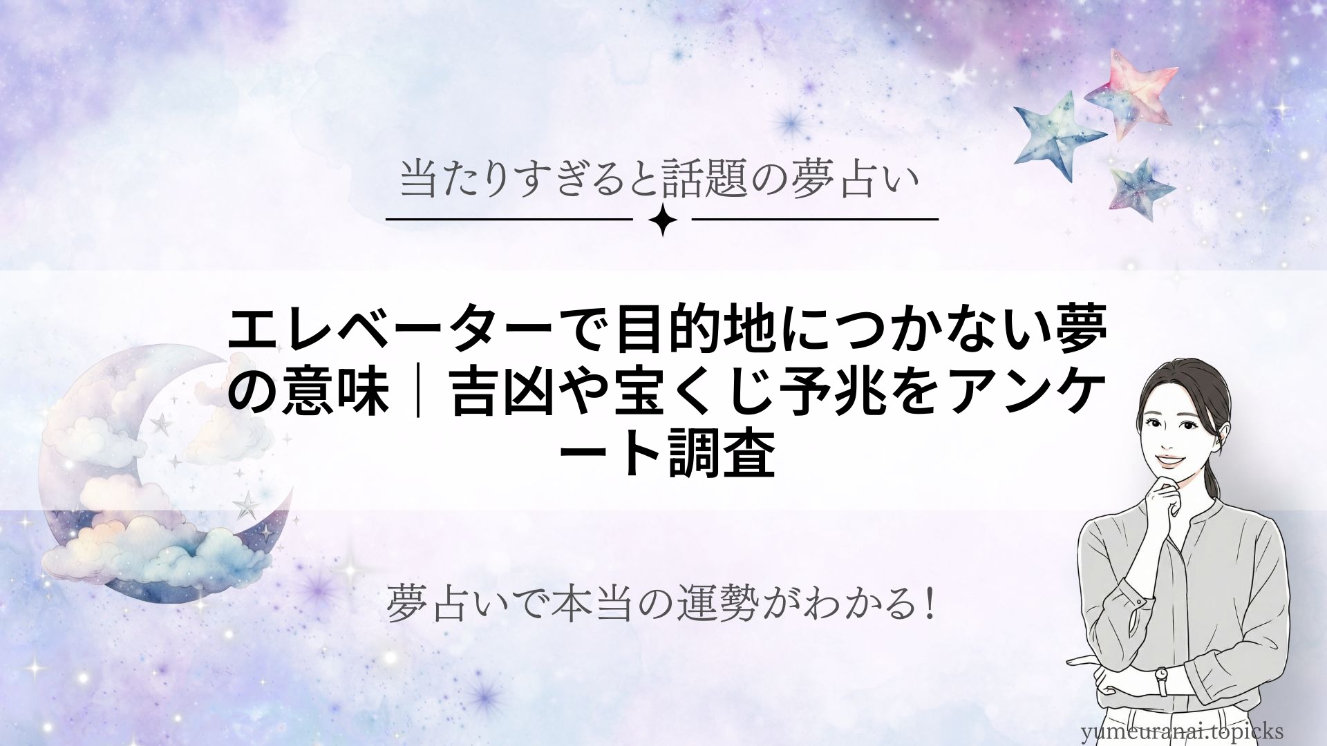 エレベーターで目的地につかない夢を見て、不安や疑問を感じたことはありませんか? この夢は、現実のあなたの環境や心の状態を映し出すことが多いといわれています。 この記事では、アンケート調査結果や夢占いの専門的な視点を交えながら、エレベーター... -